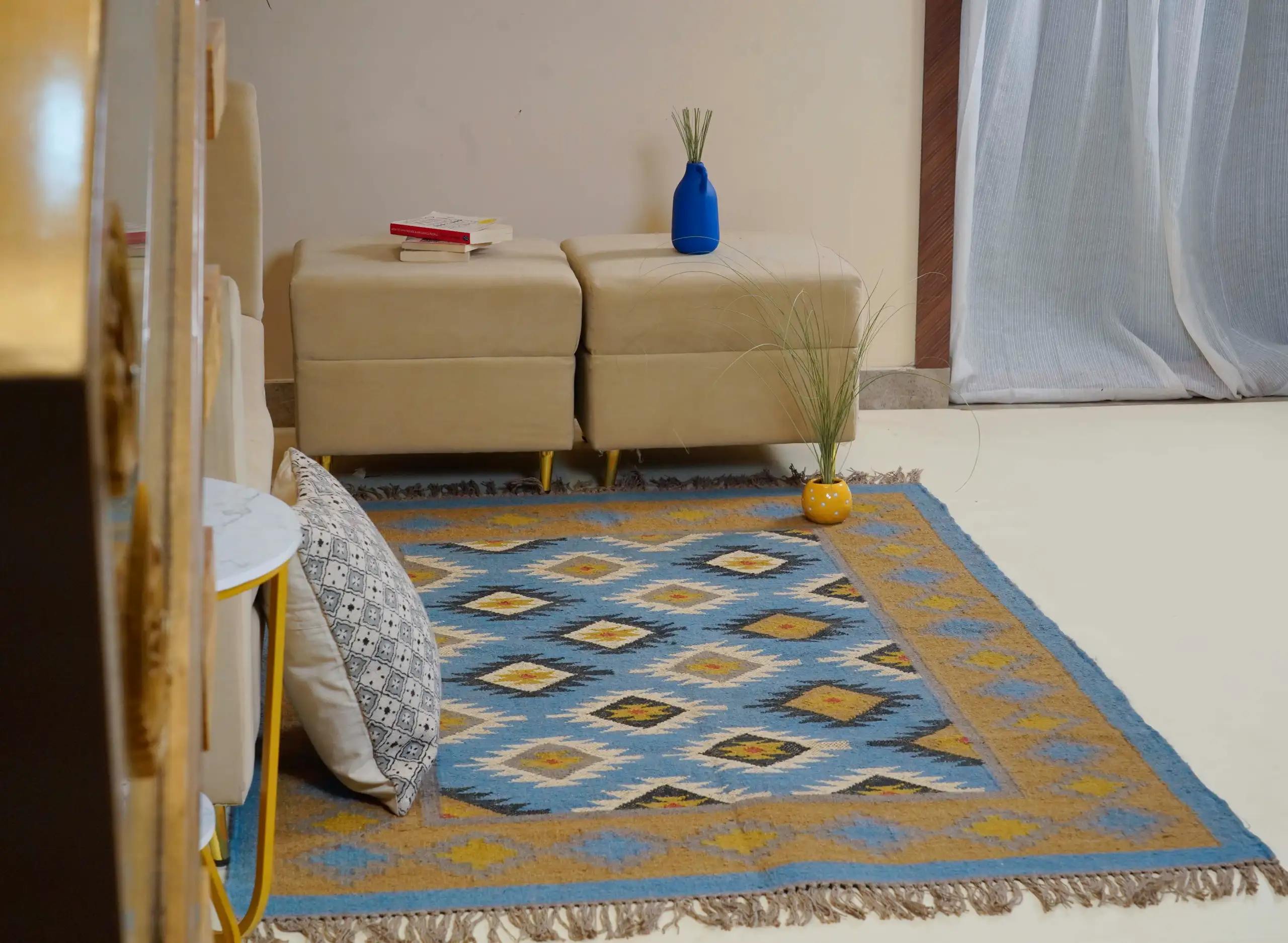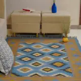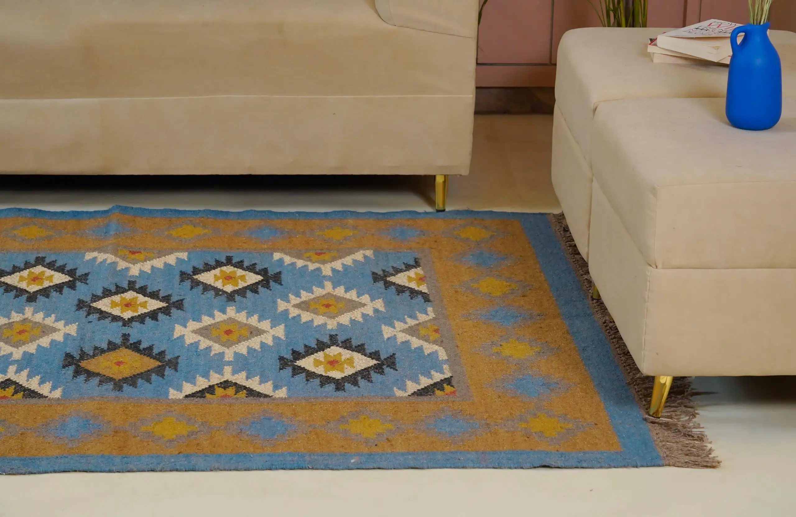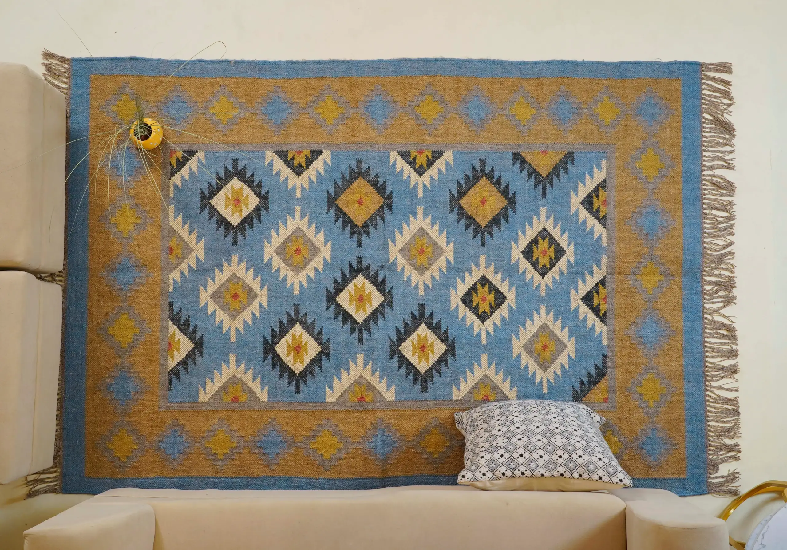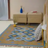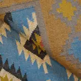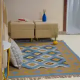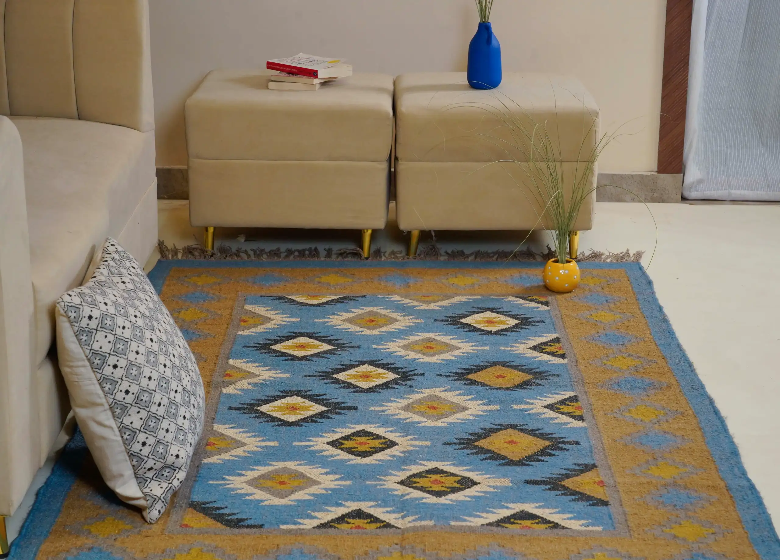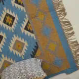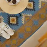 Geometric wool jute kilim rug with rustic patterns and neutral tones, handcrafted for durability while adding natural character to busy living spaces and everyday interiors.