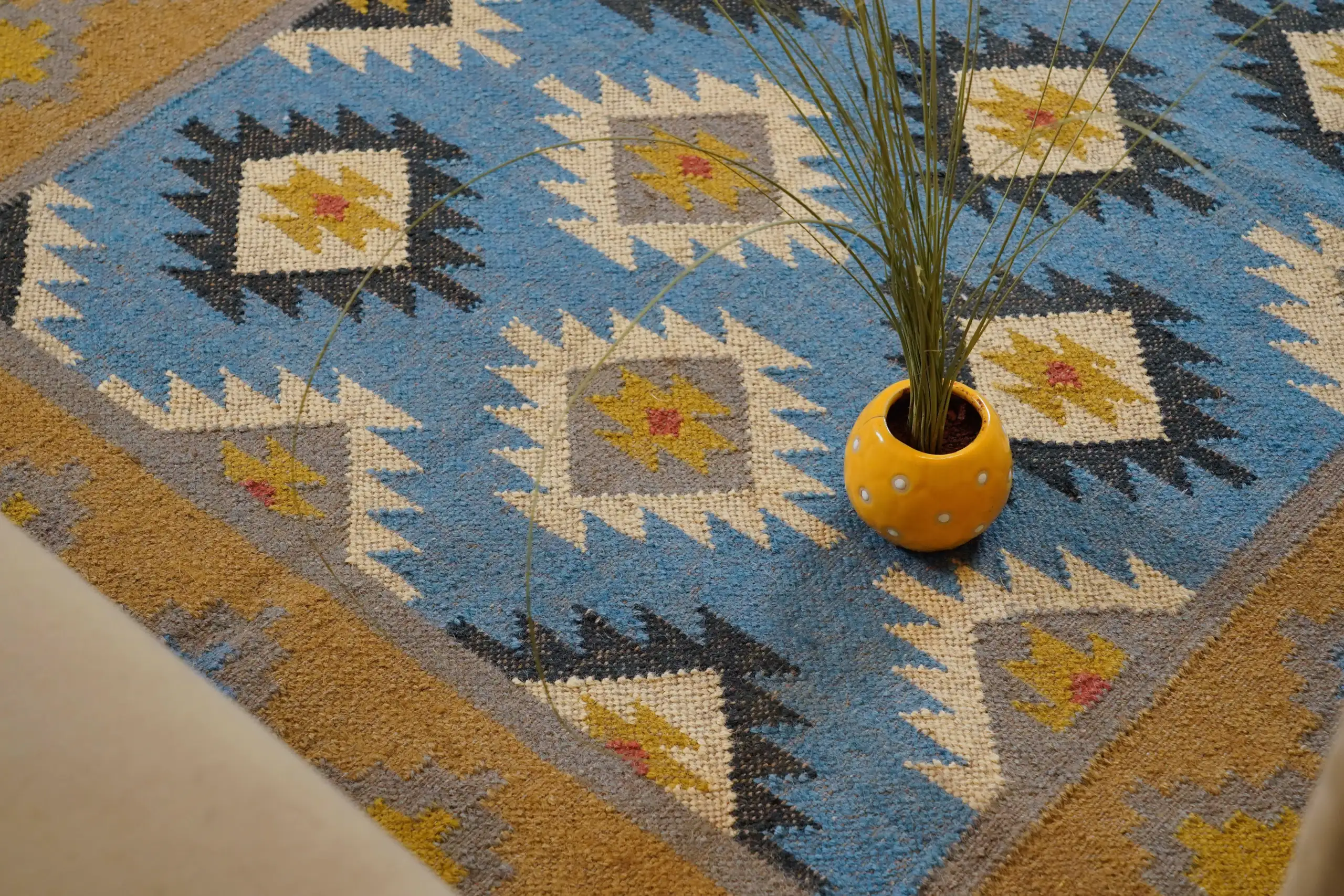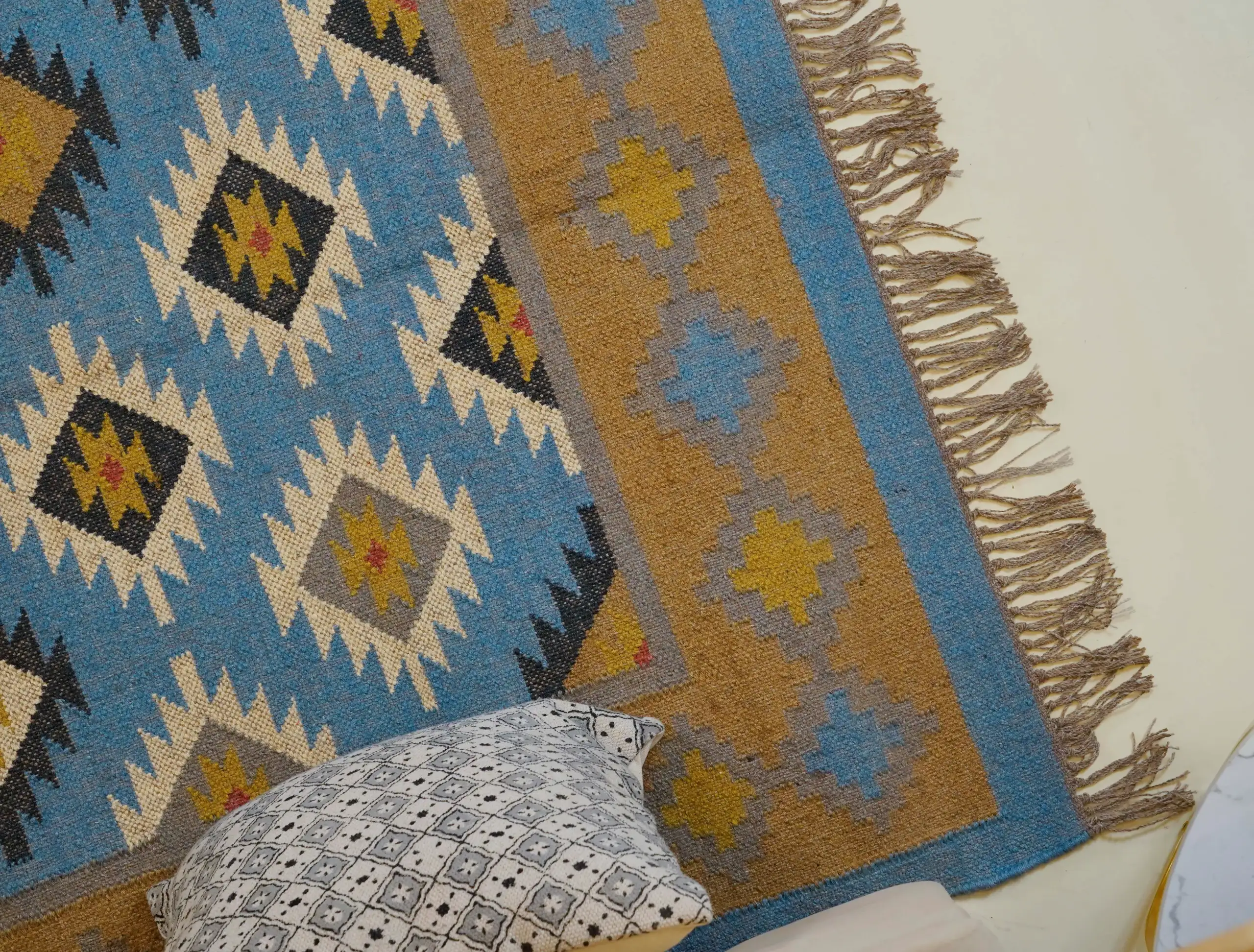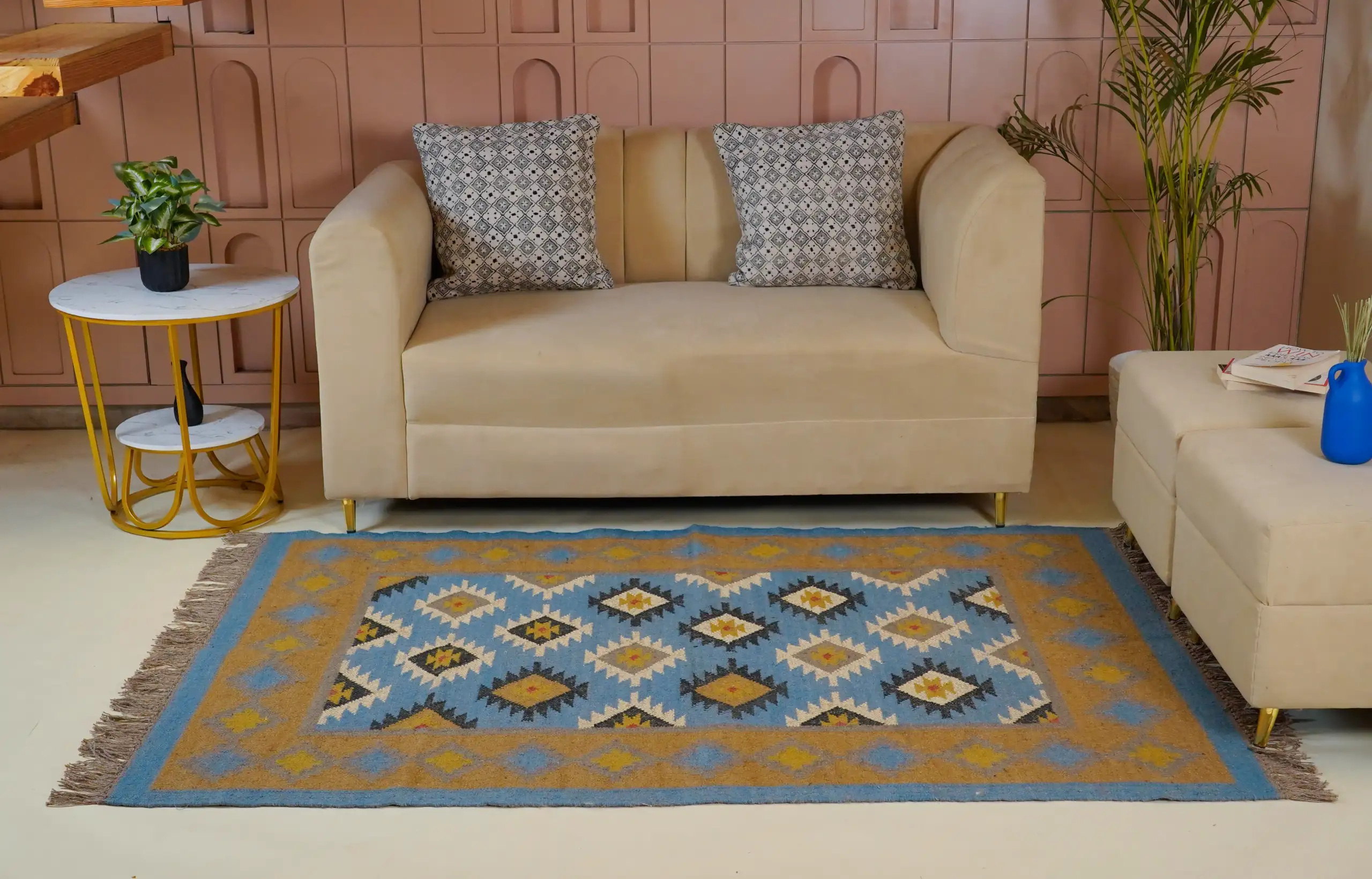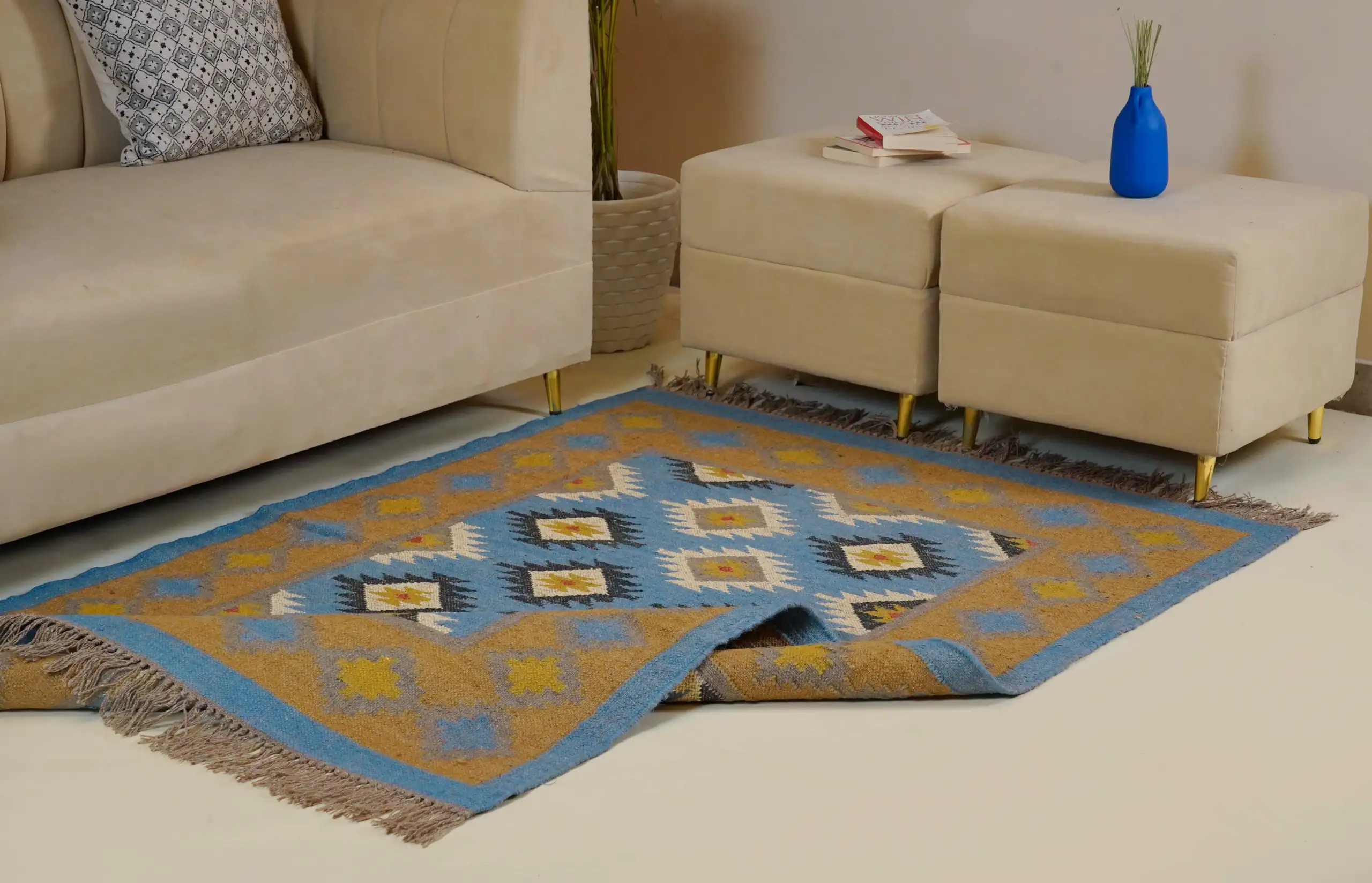 Geometric wool jute kilim rug with rustic patterns and neutral tones, handcrafted for durability while adding natural character to busy living spaces and everyday interiors.