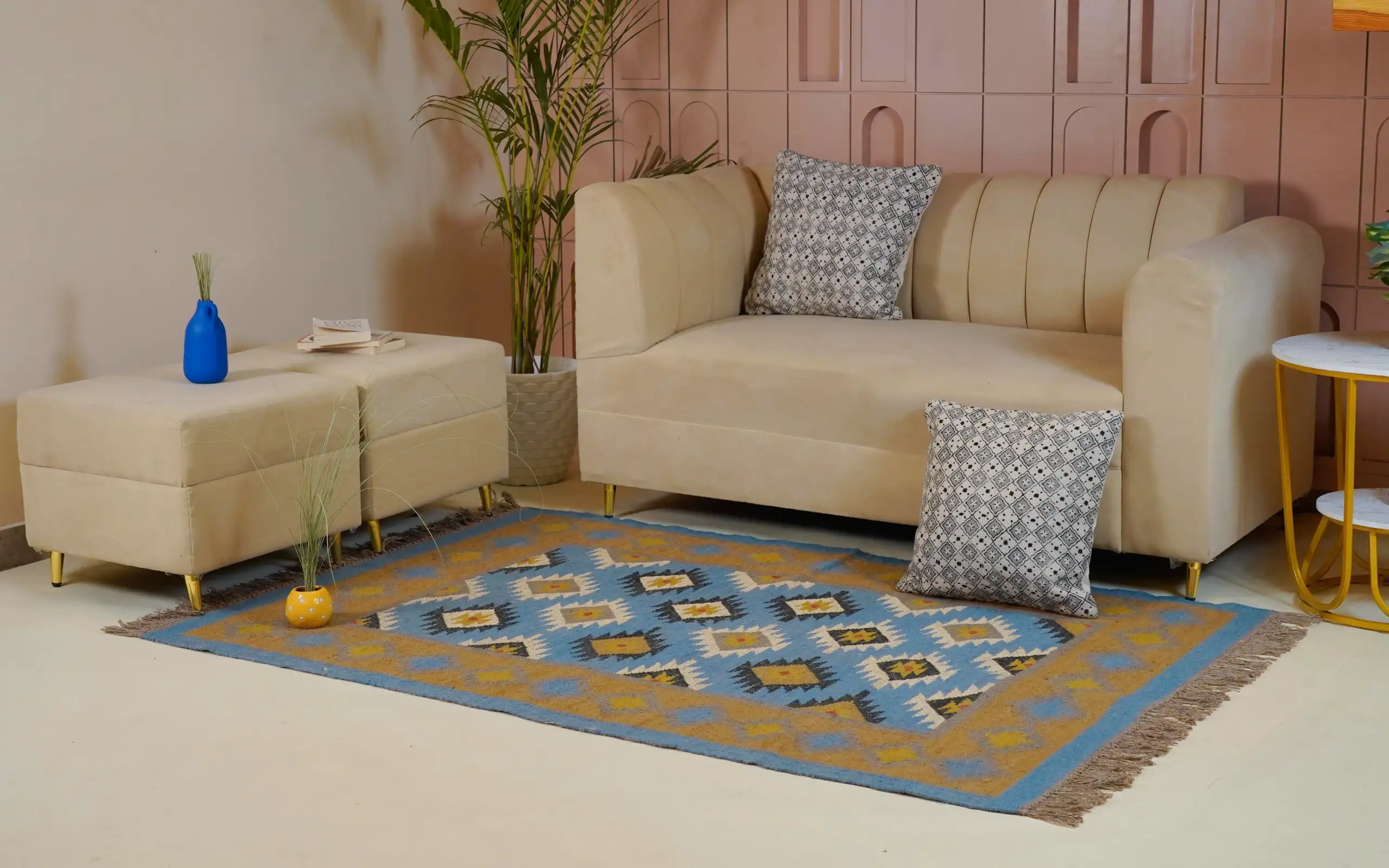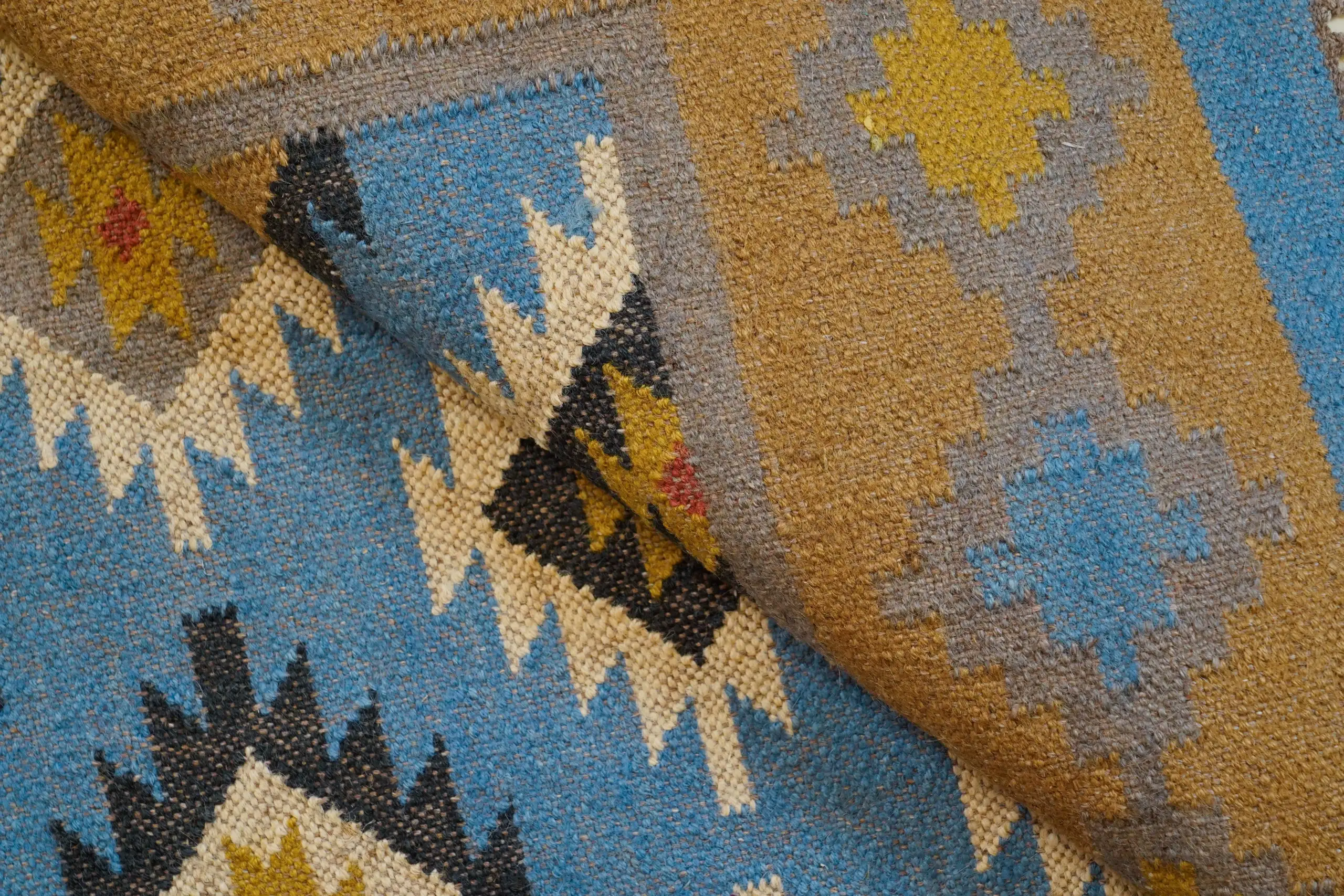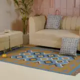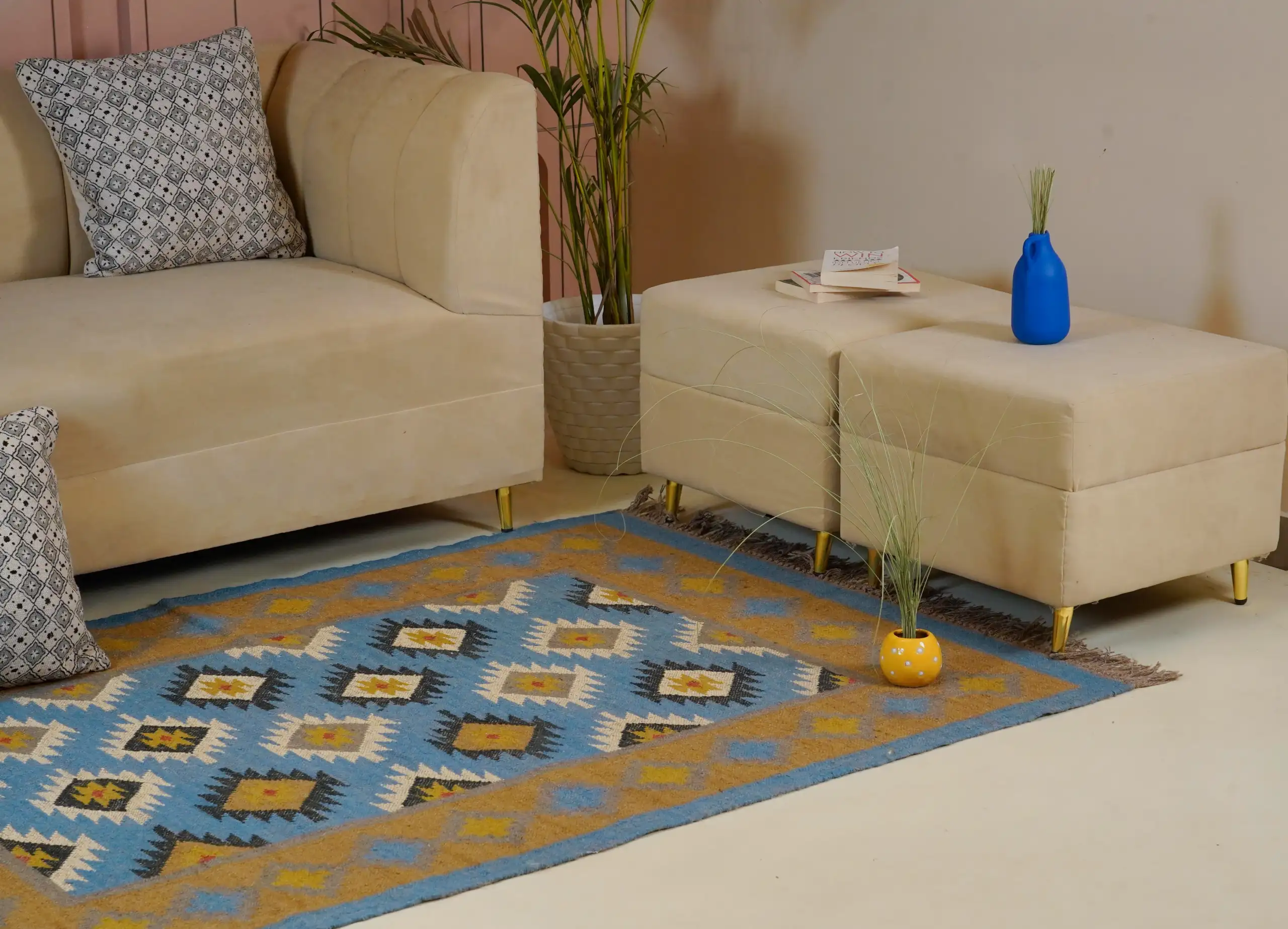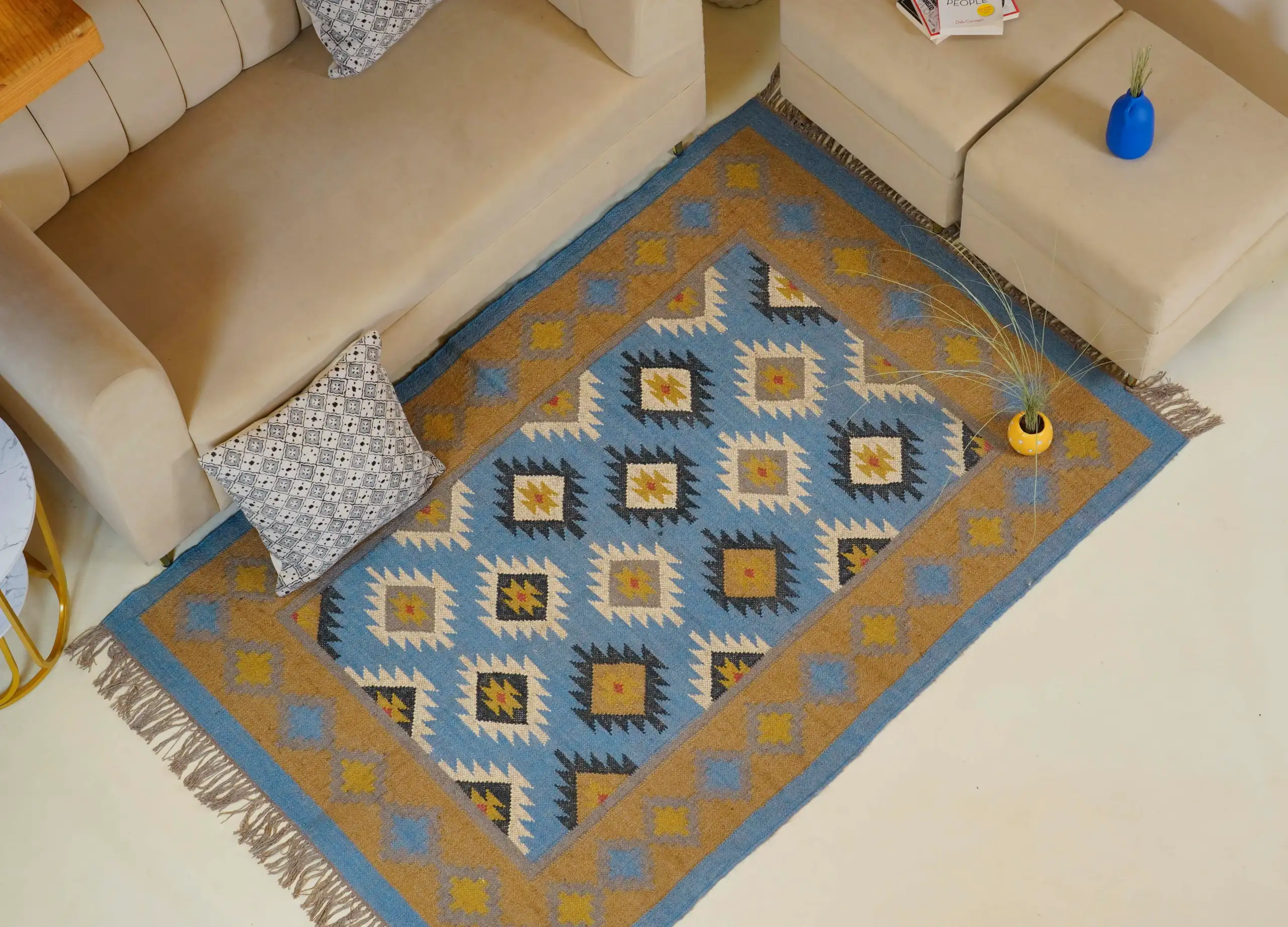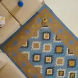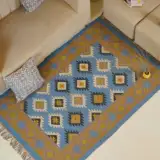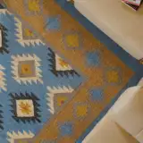 Geometric wool jute kilim rug with rustic patterns and neutral tones, handcrafted for durability while adding natural character to busy living spaces and everyday interiors.