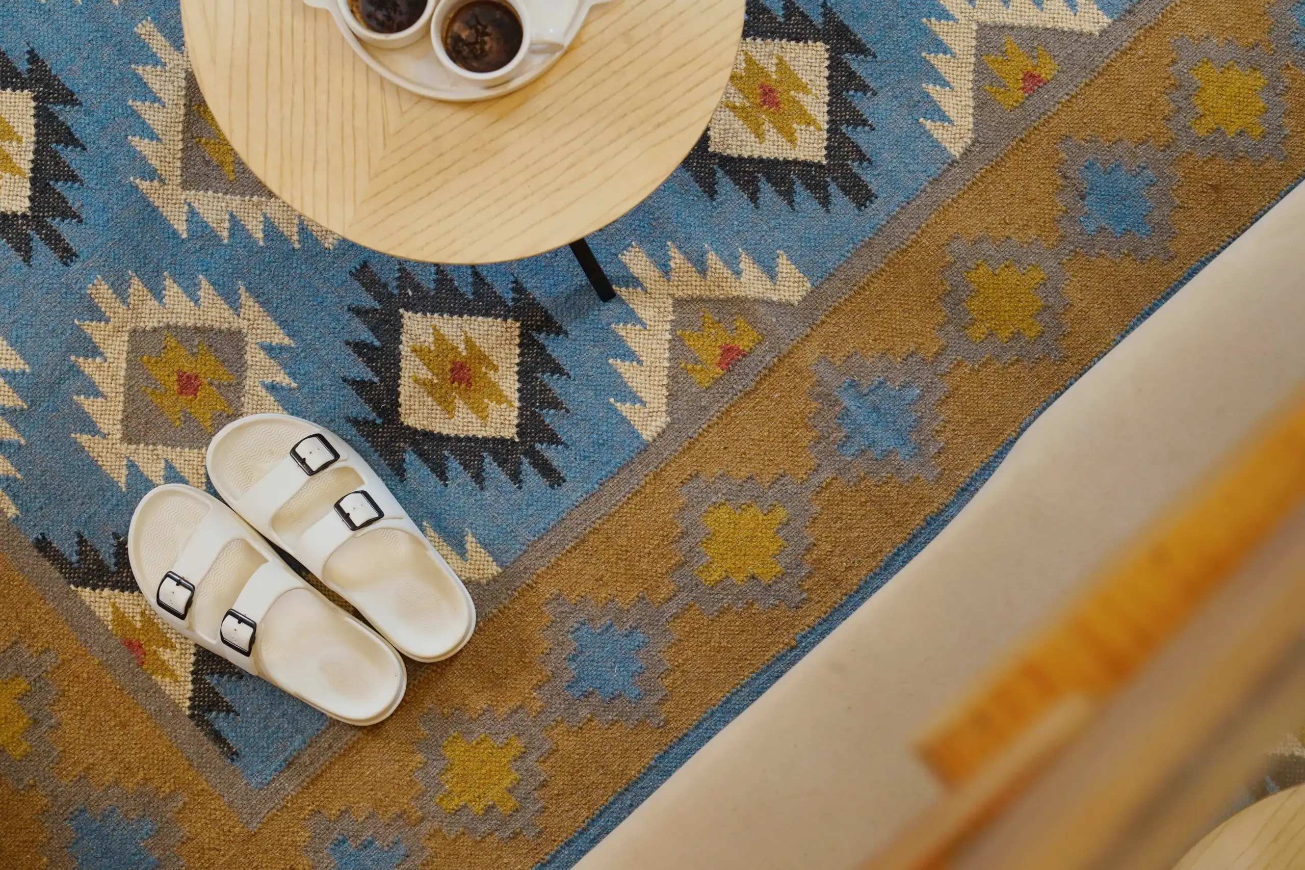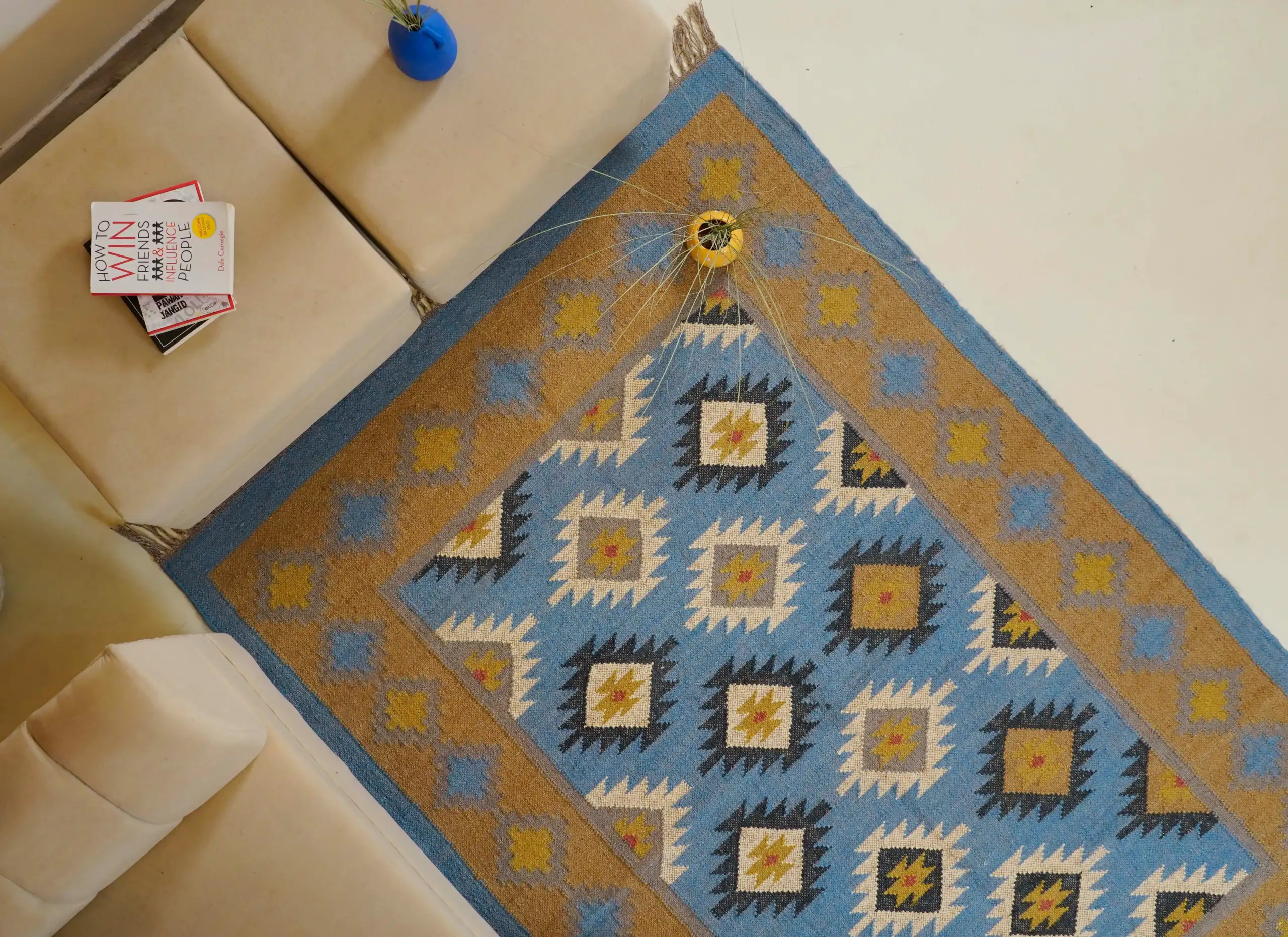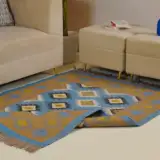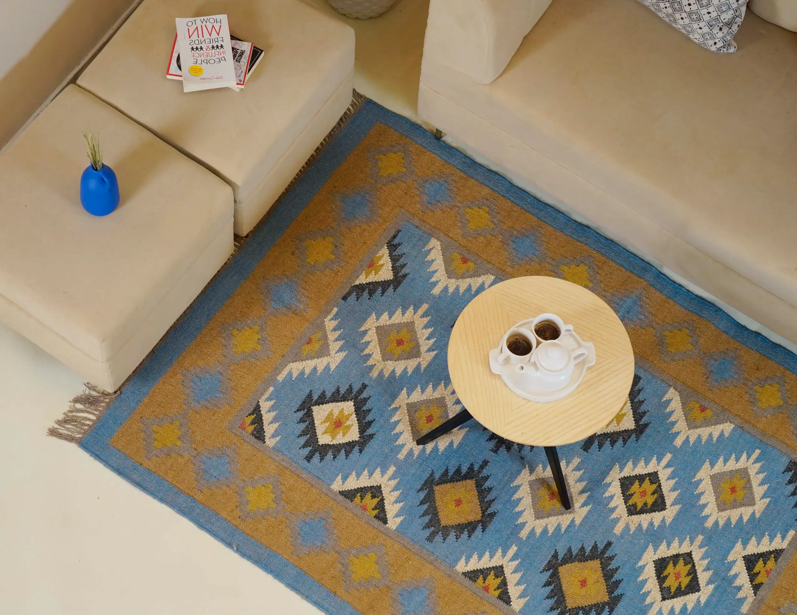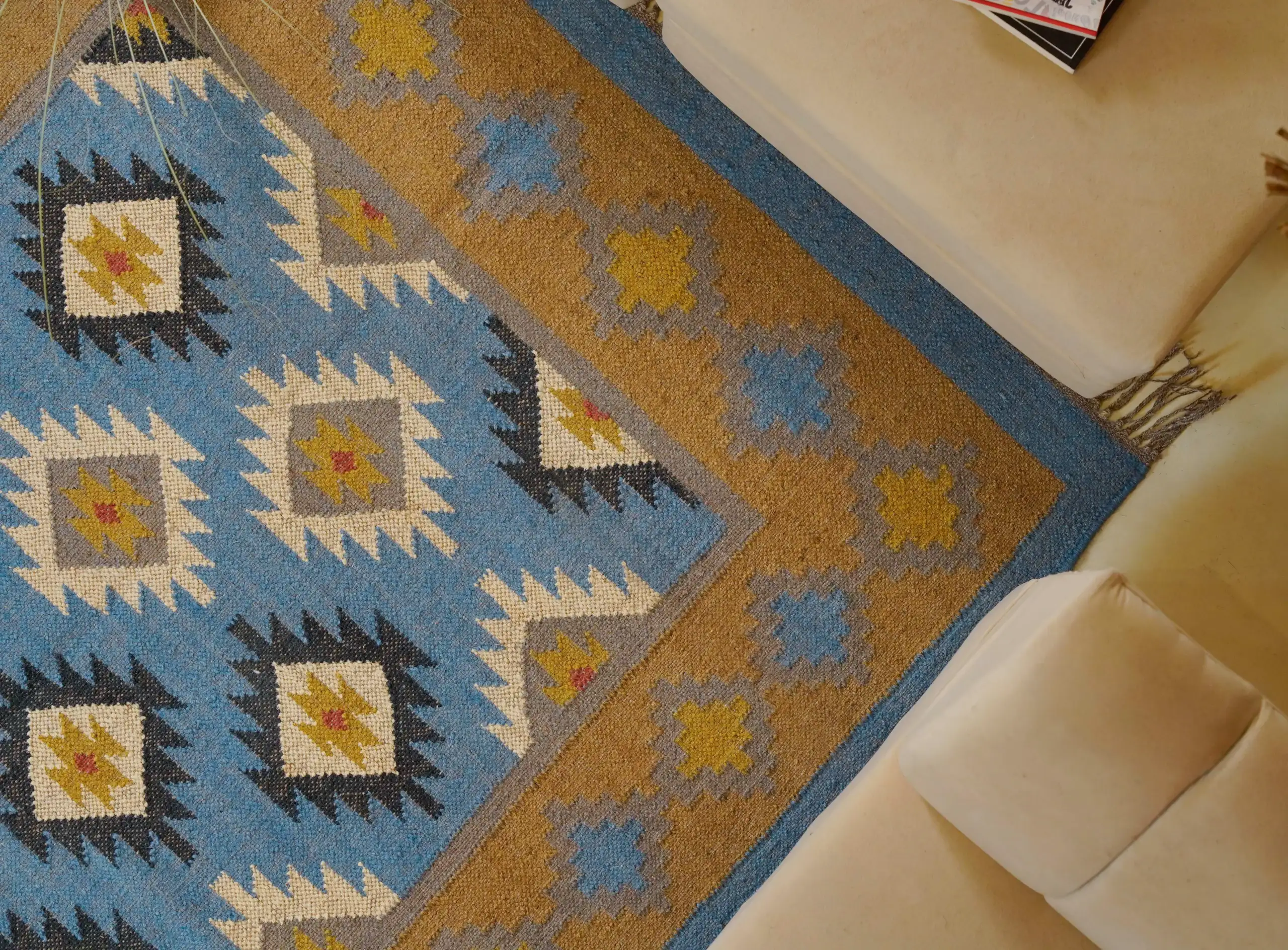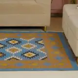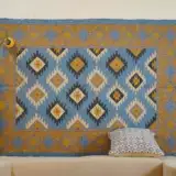 Geometric wool jute kilim rug with rustic patterns and neutral tones, handcrafted for durability while adding natural character to busy living spaces and everyday interiors.