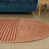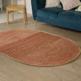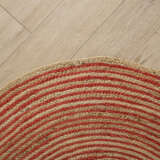 Rustic round jute braided rug in natural earth tones, ideal for layered decor and designed to add warmth and texture to cozy indoor living spaces.