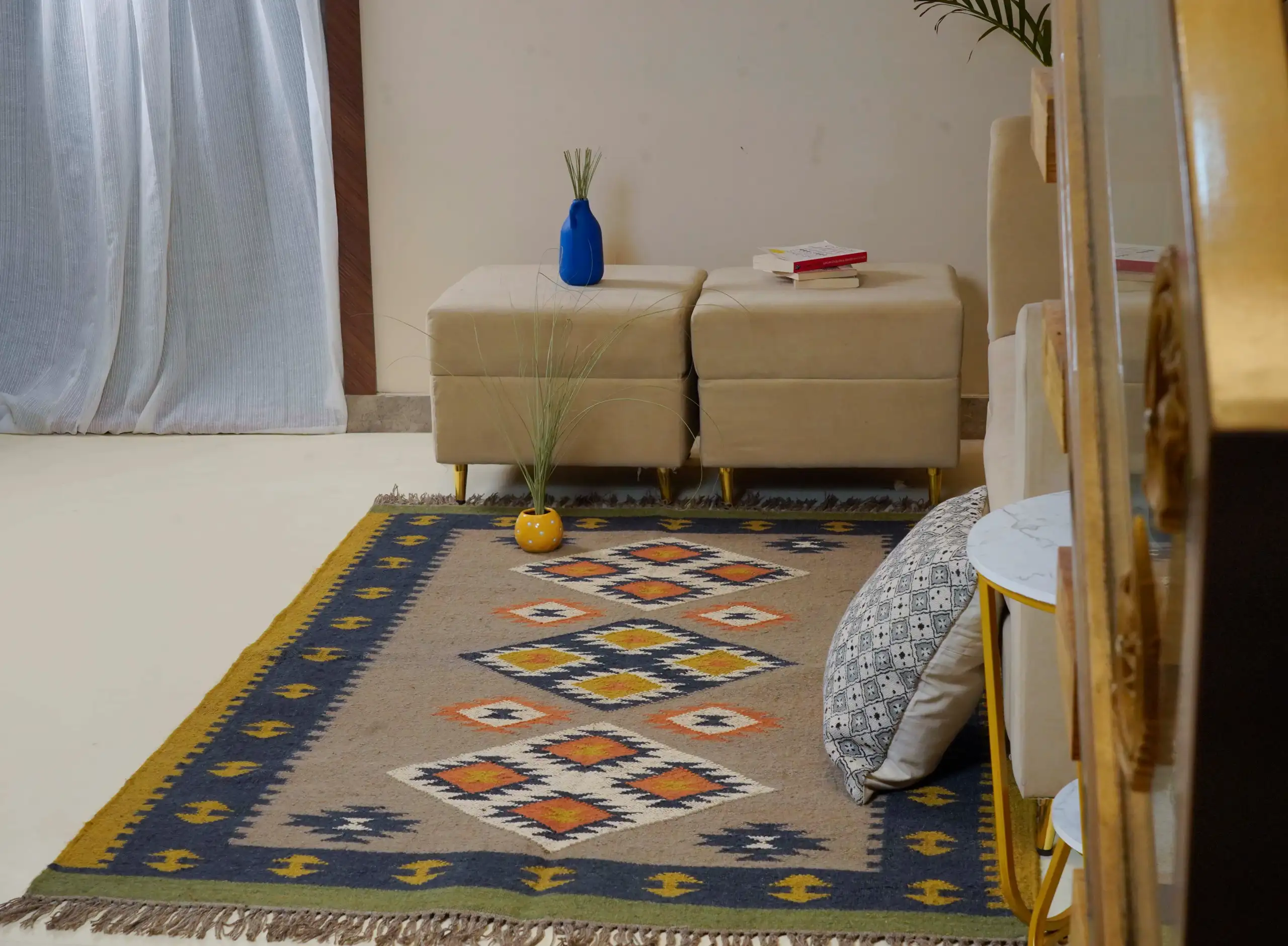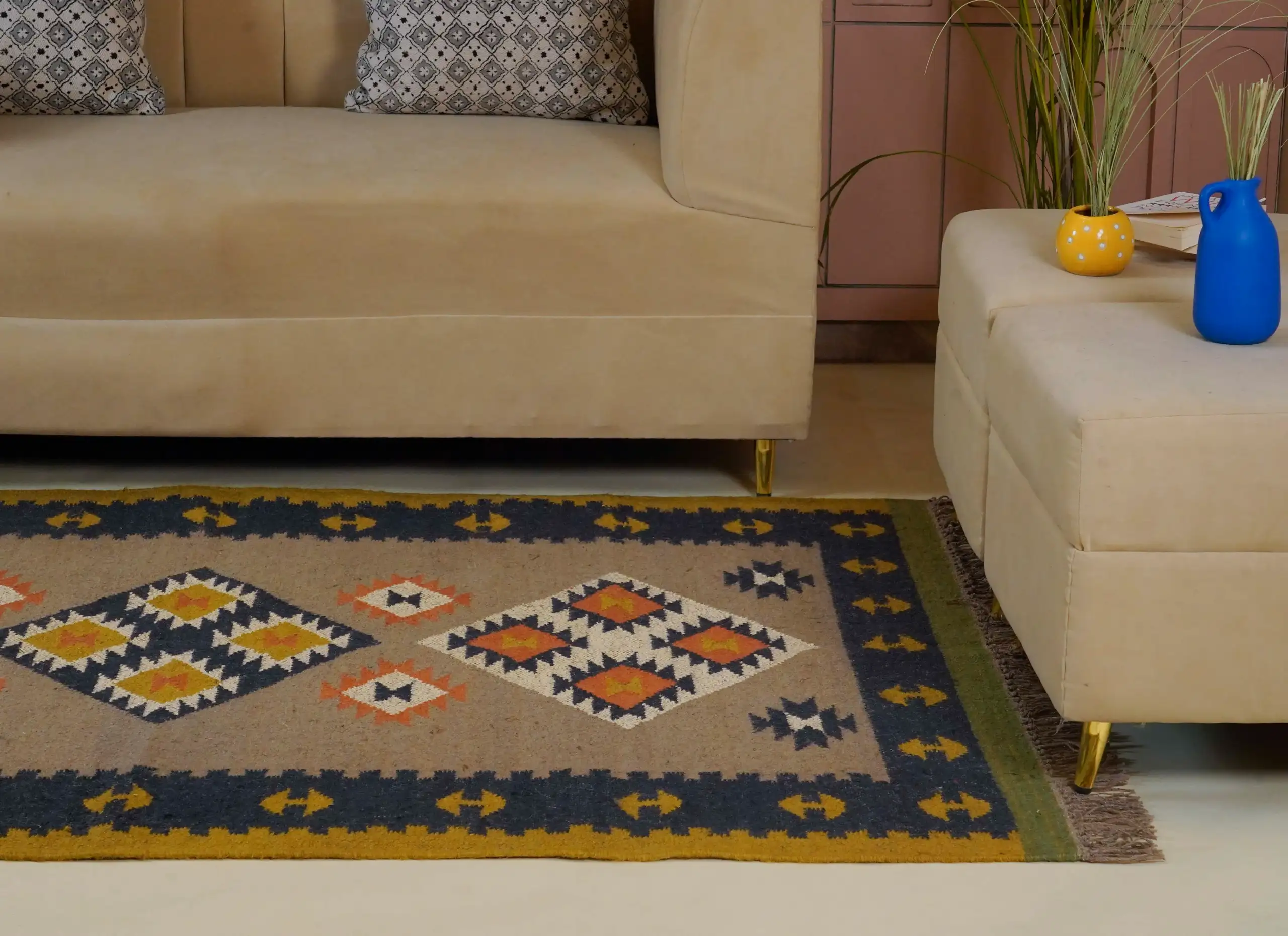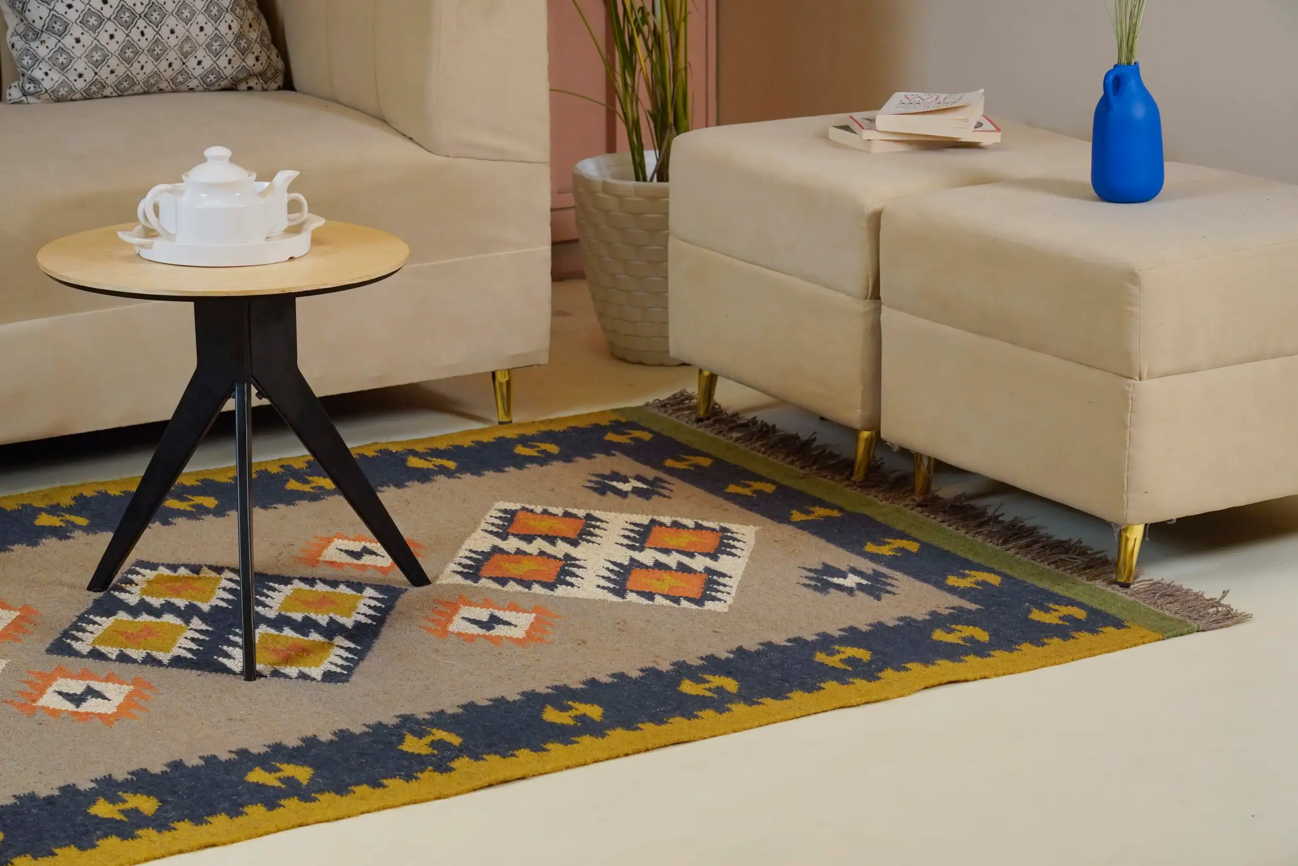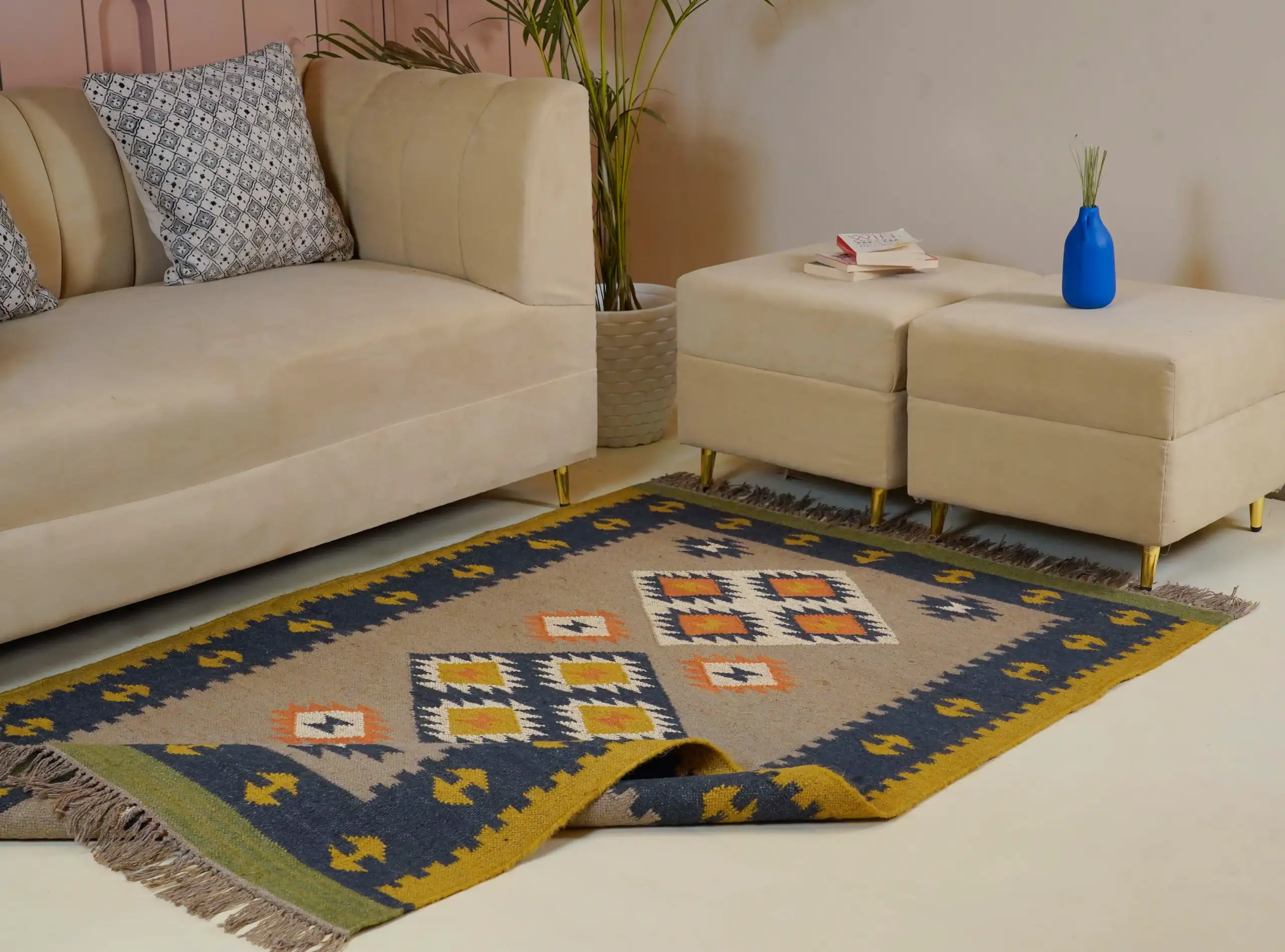 Vintage style wool jute kilim rug in soft natural beige tones, featuring a timeless handcrafted look perfect for cozy homes and minimal interior decor.
