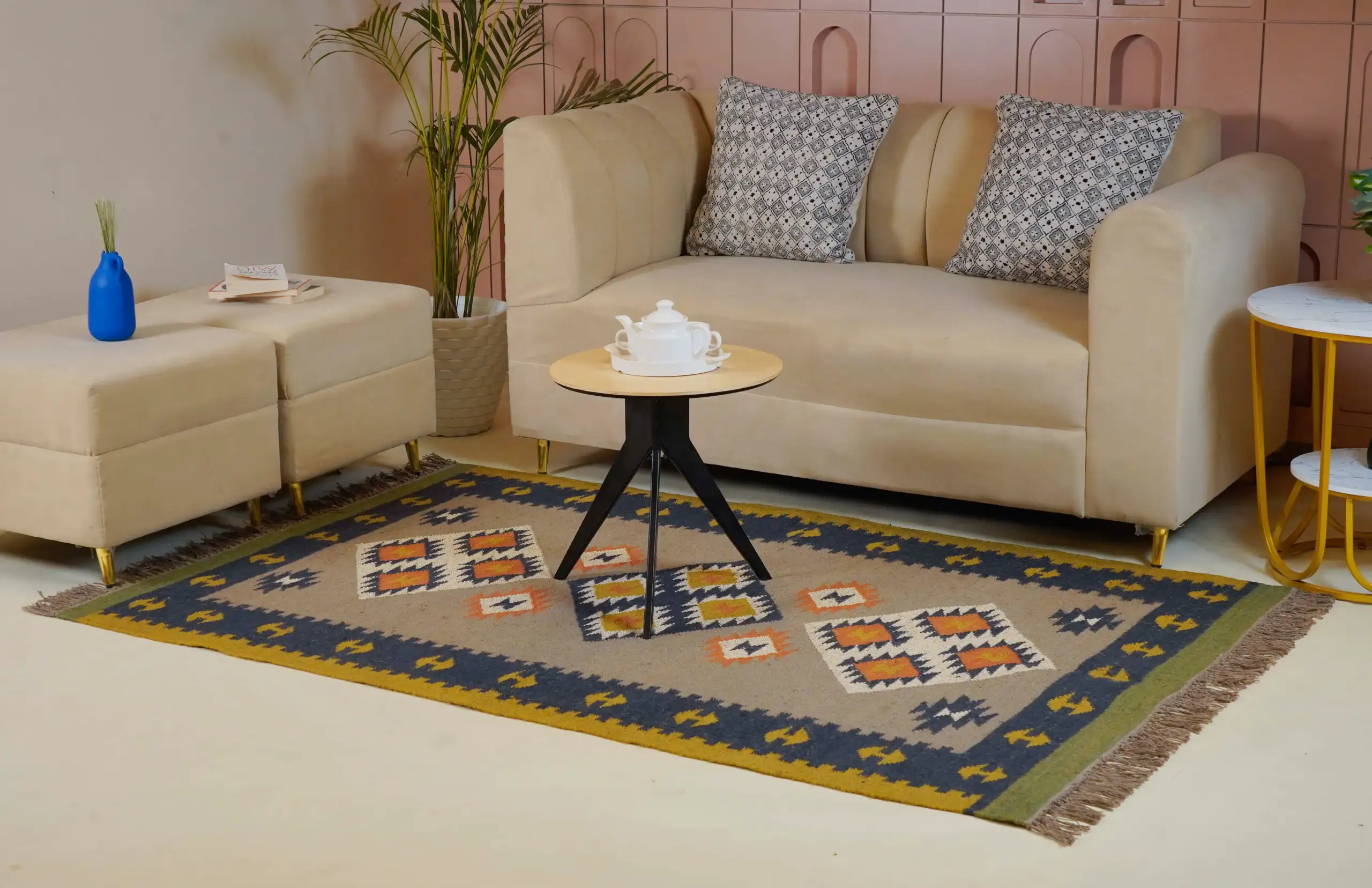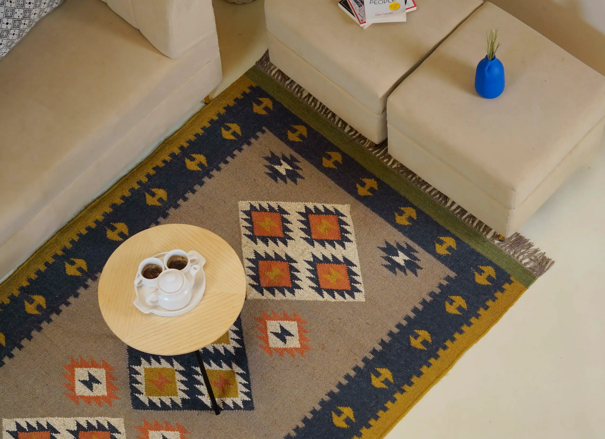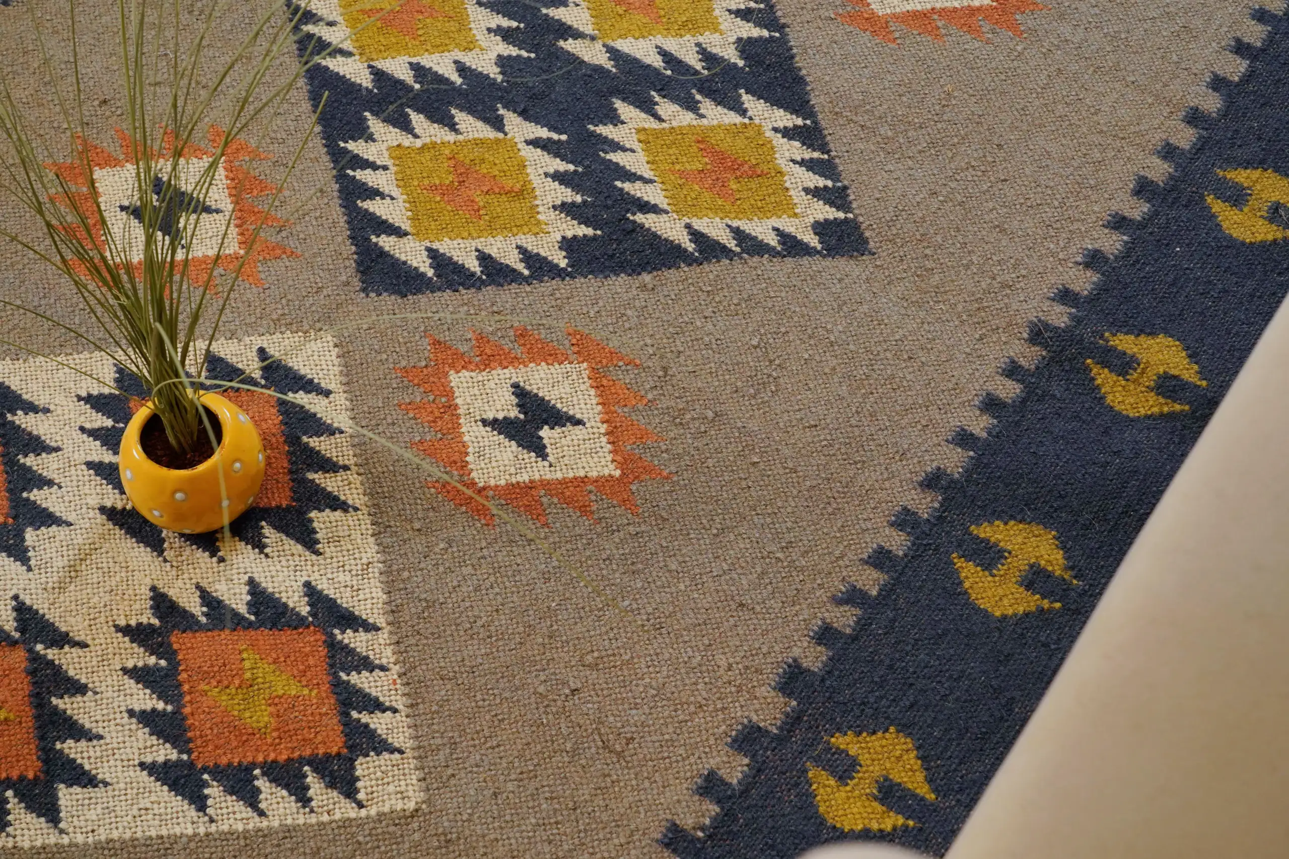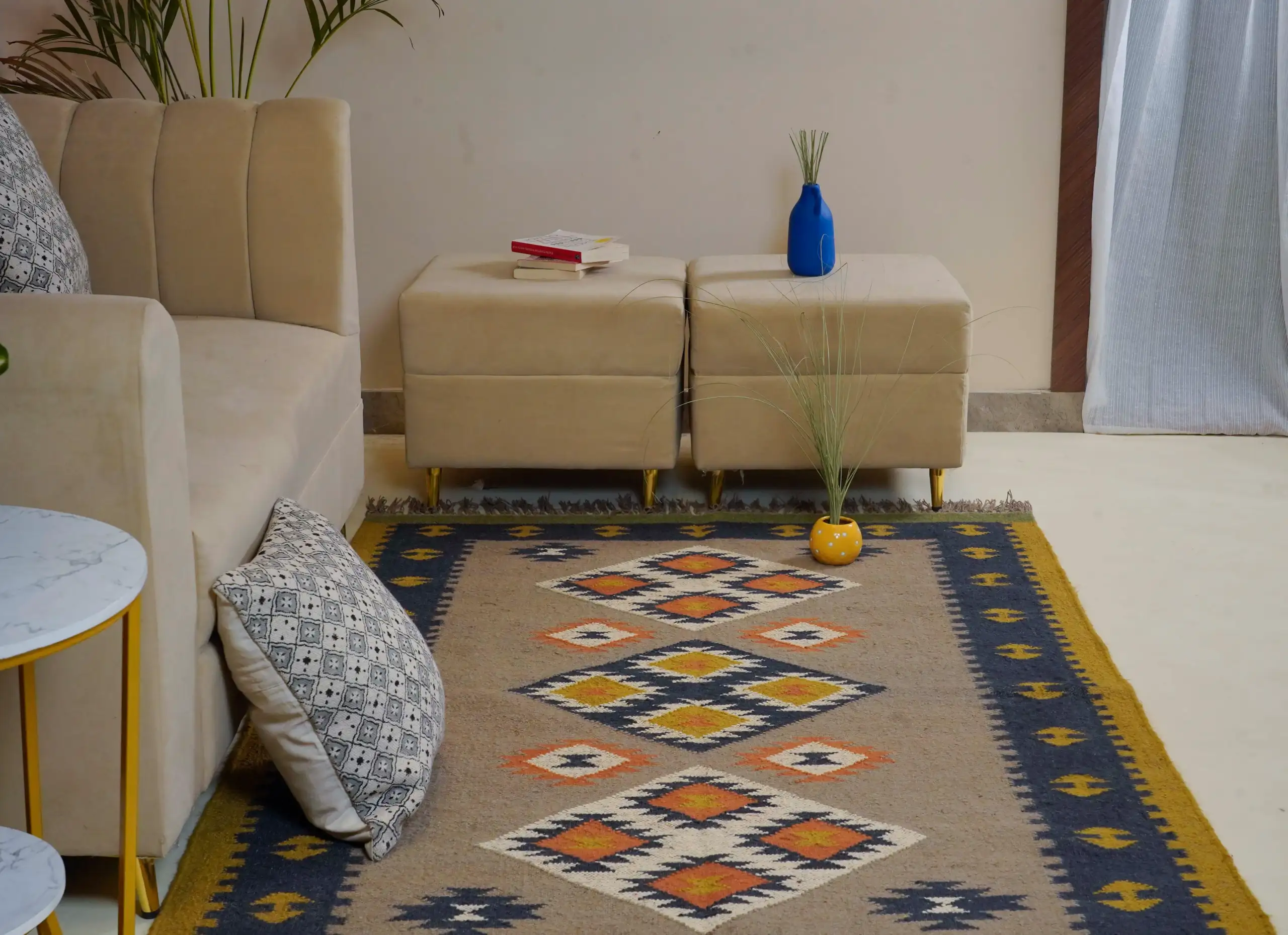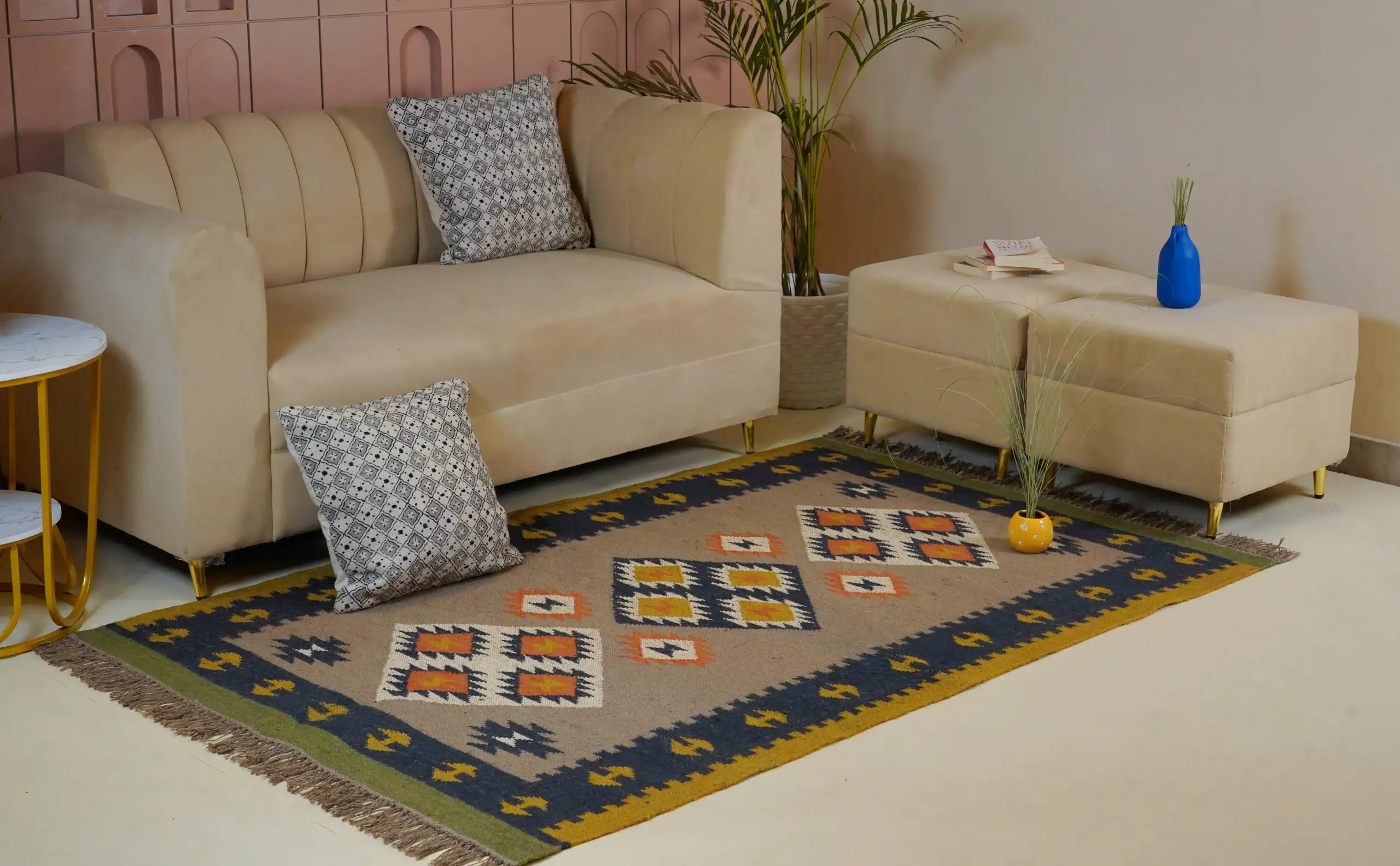 Vintage style wool jute kilim rug in soft natural beige tones, featuring a timeless handcrafted look perfect for cozy homes and minimal interior decor.