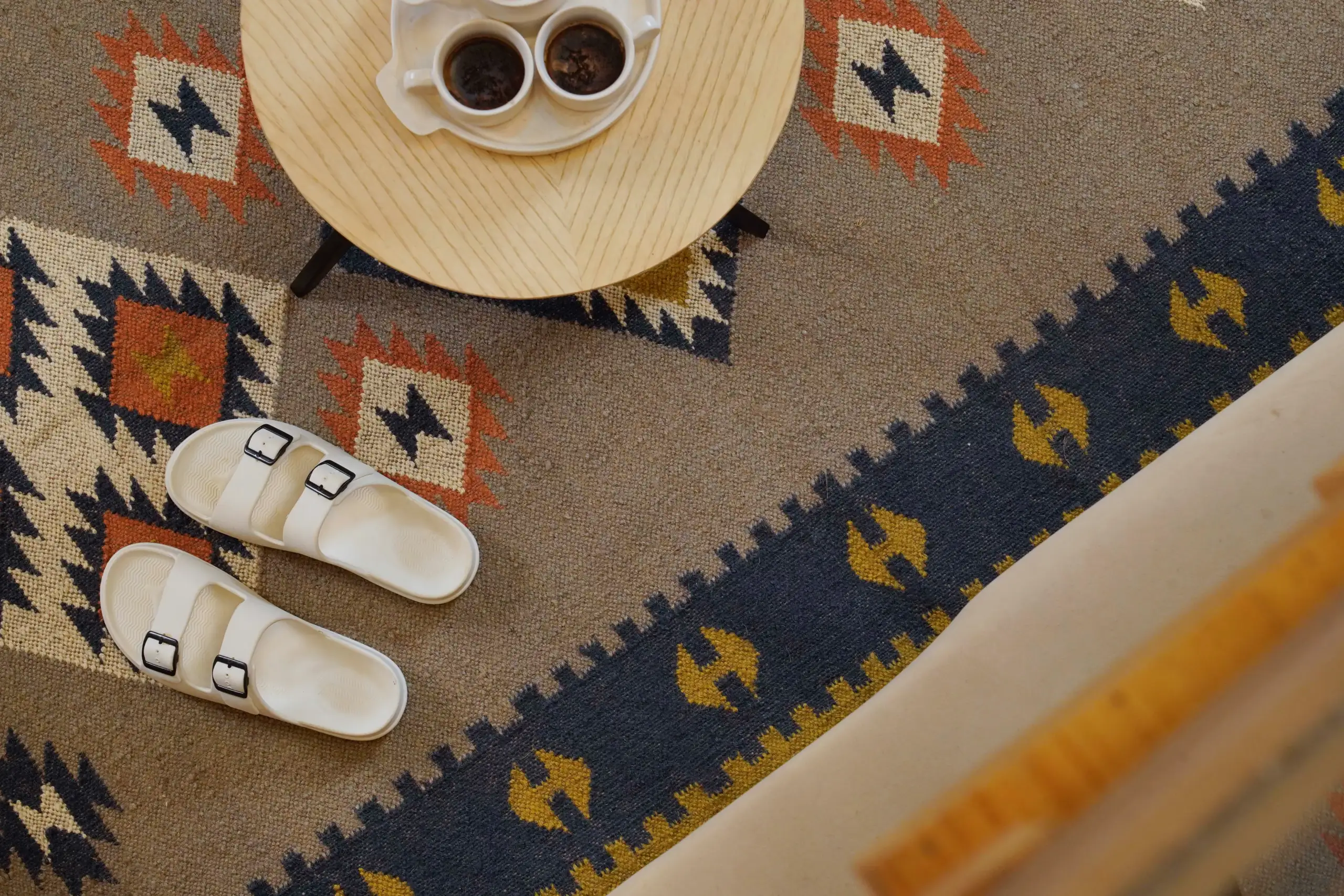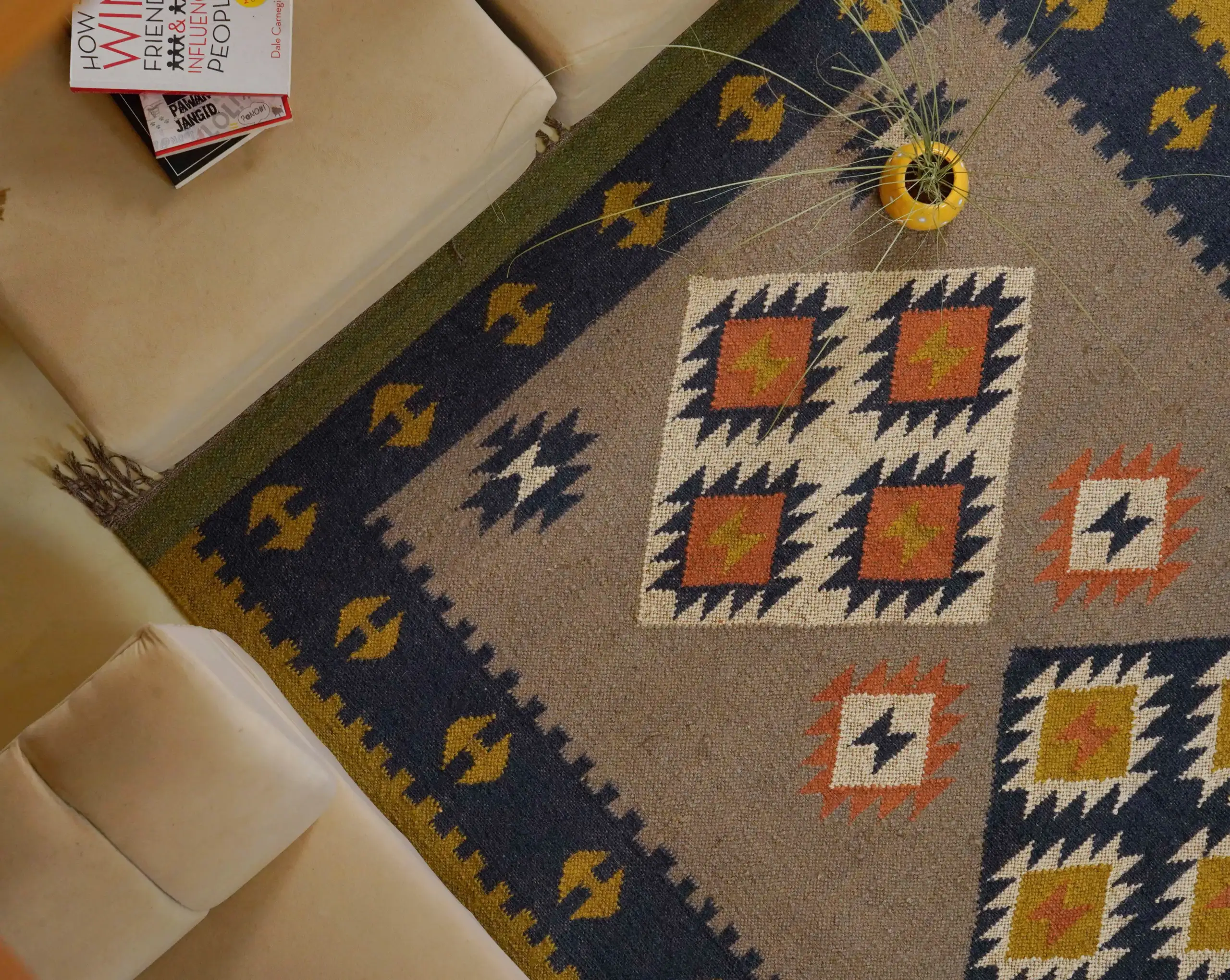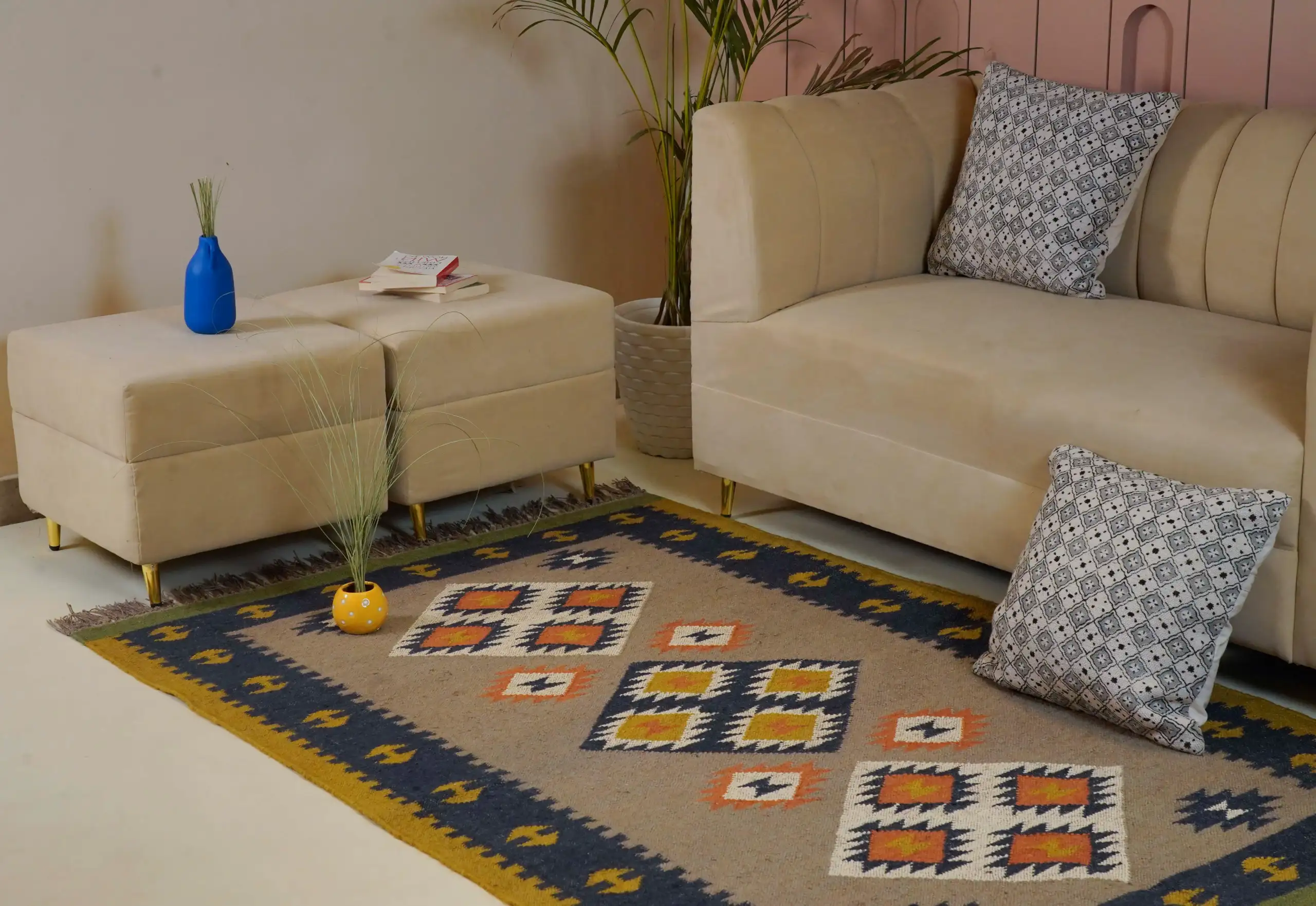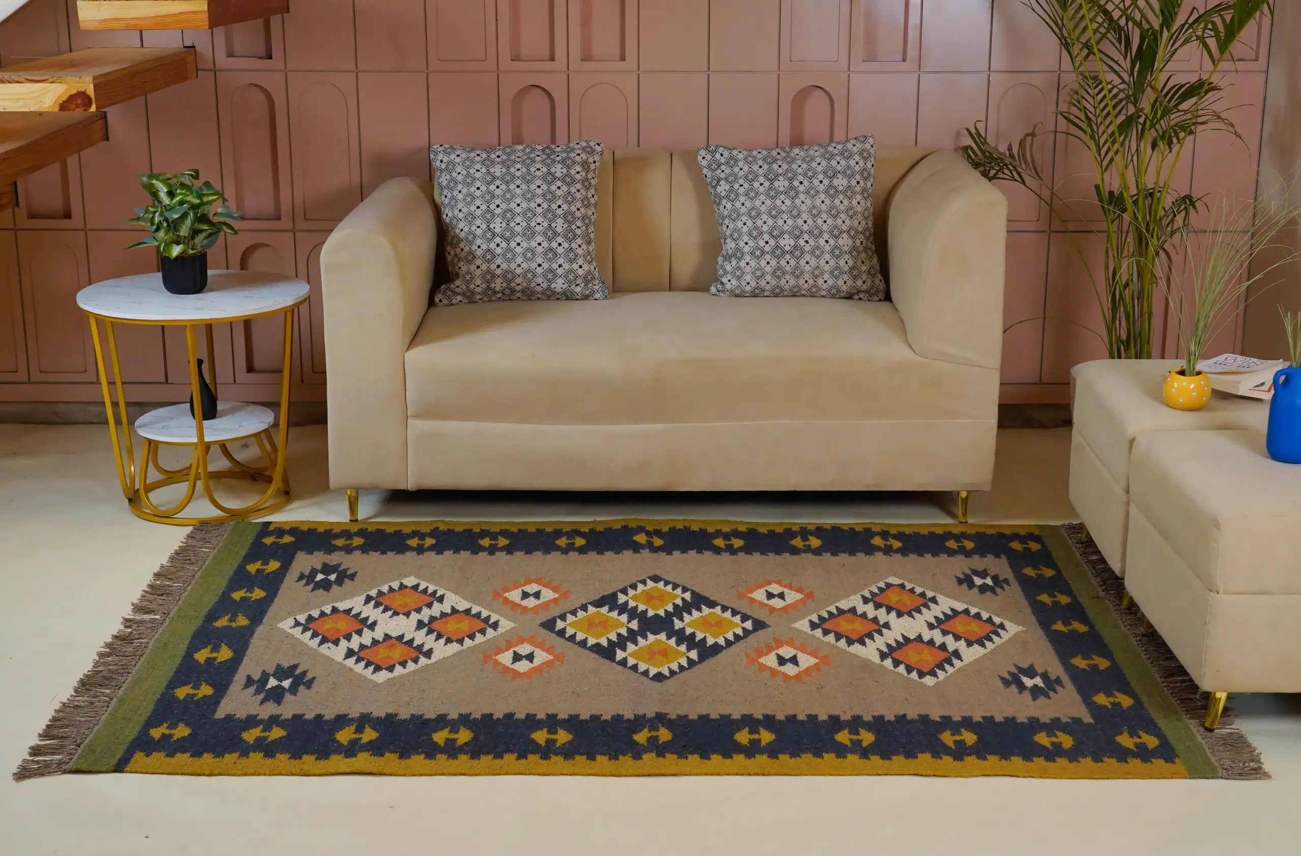 Vintage style wool jute kilim rug in soft natural beige tones, featuring a timeless handcrafted look perfect for cozy homes and minimal interior decor.